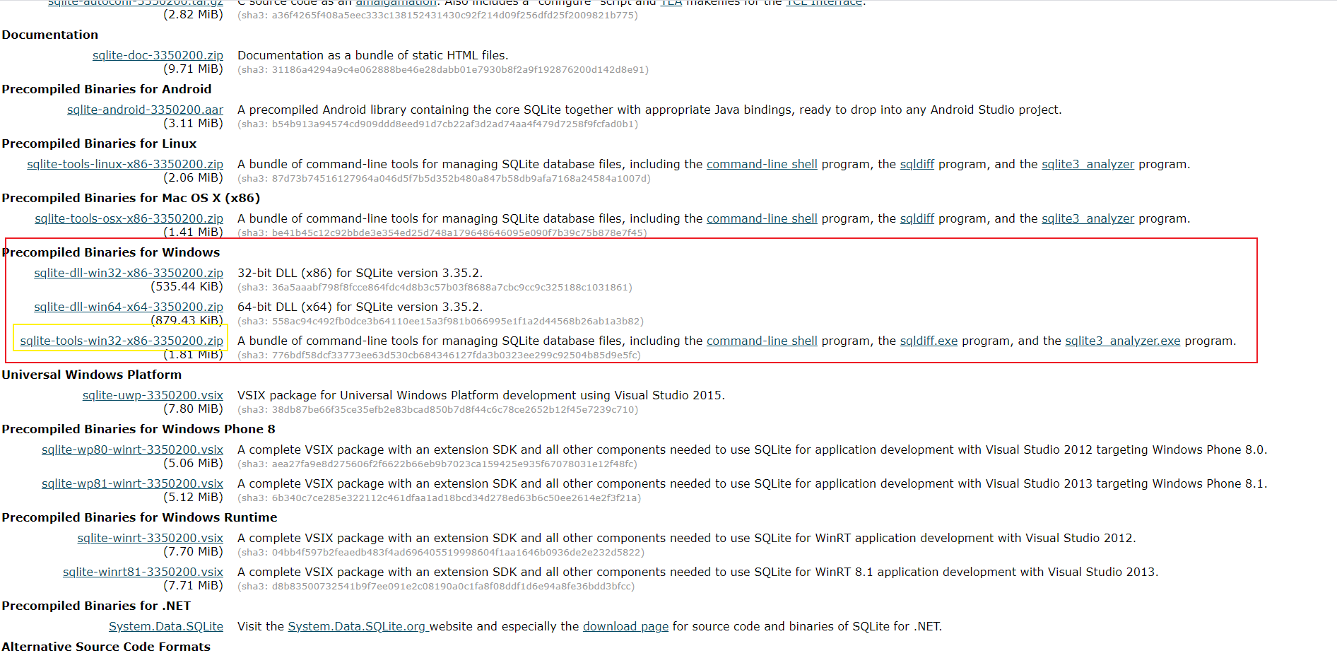 需要下载 sqlite-dll-win32-86-xx.zip 或者 sqlite-dll-win64-xx.zip 以及 sqlite-tools-win32-x86-xx.zip