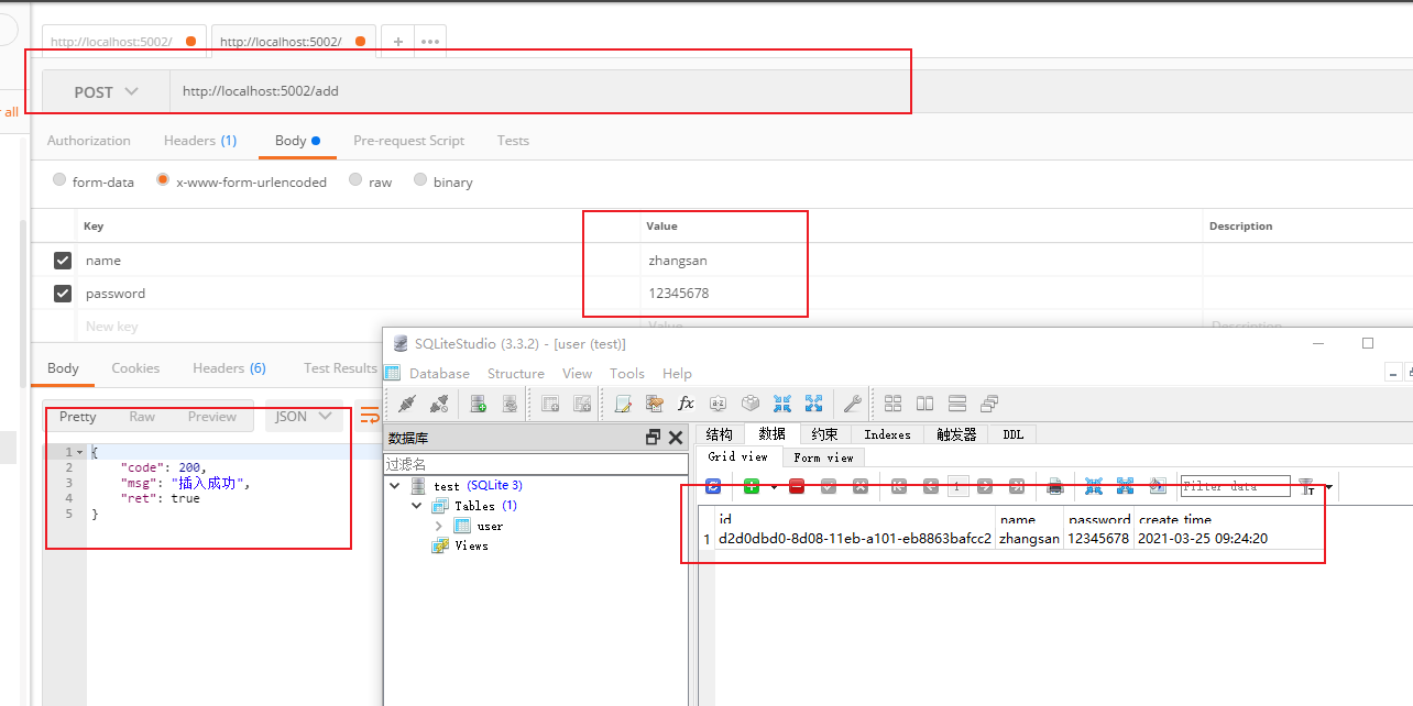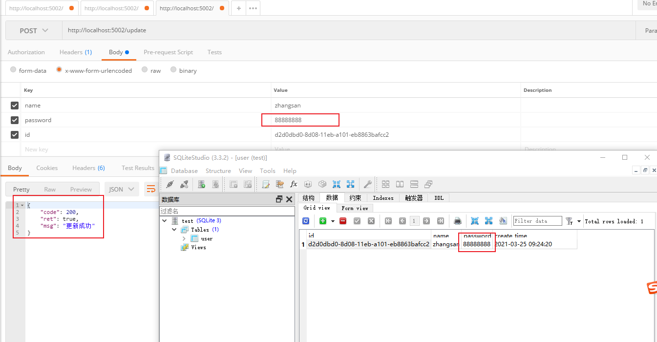结果返回插入成功,同时刷新数据库,能看到插入的最新的一条数据。修改用户