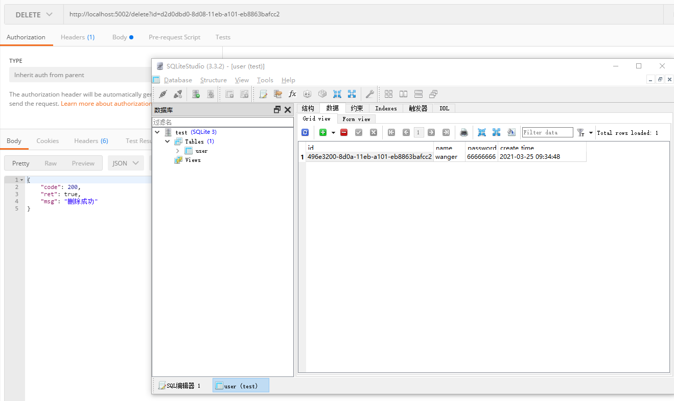 根据用户 id 删除用户。//删除 const delUser = function(req,res){ const param = req.query || req.params ; const id = param.id; const del_sql = `delete from user where id = ?`; db.run(del_sql,[id],function (err) { if(err){ res.send({ msg:'删除失败', ret:false }) } res.send({ code:200, ret:true, msg:'删除成功' }) }) }结果如下: