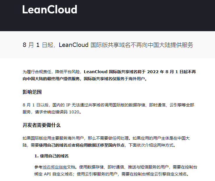 而这个调整带来的后果就是 Valine + LeanCloud 搭建的评论系统以及相关的评论内容管理系统和邮件通知就无