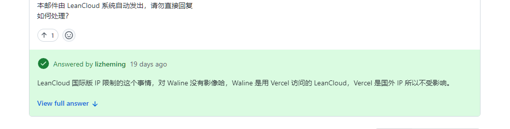 LeanCloud 国际版 IP 限制的这个事情,对 Waline 没有影像哈,Waline 是用 Vercel 访问的 LeanCloud,Vercel 是国外 IP 所以不受影响。